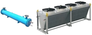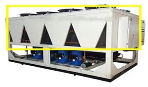 The air-cooled condenser of a chiller, which is larger in size, is a type of air-cooled heat exchanger. In this system, the refrigerant flows through tubes, and air is blown around the tubes (by fans). Heat is transferred from the walls of the tubes to the air. Since the refrigerant directly dissipates its excess heat to the air, there is no need for a cooling tower or water in an air-cooled chiller. The refrigerant changes phase from gas to liquid by releasing its excess heat to the air.