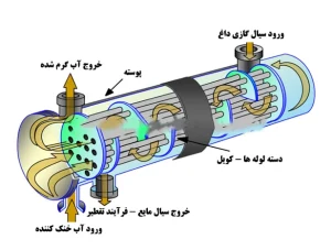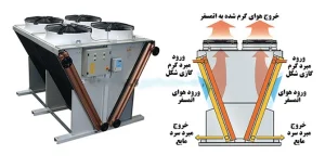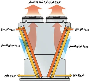 When there is limited access to water, when water cooling is not feasible due to hygiene reasons, or when only a small amount of condensation capacity is needed, an air-cooled condenser is used instead of the shell and tube (or water-cooled) type. As shown in the diagram below, this air-cooled condenser, also known as an air-cooled unit, operates similarly to a radiator. In this type, the hot gaseous fluid enters the condenser’s tubes (coils) from one side. One or more fans then blow air over the tubes, removing heat from the fluid, which gradually cools the gas until it condenses into a liquid at the tube’s outlet.