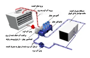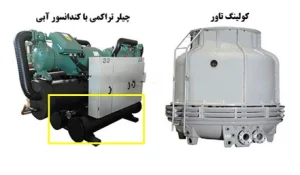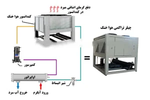 In general, there are two types of compression chillers: air-cooled compression chillers and water-cooled compression chillers, which will be discussed in this text. The water-cooled chiller is also known as a chiller with a cooling tower, and its structure will be mentioned here as well. Water-cooled and air-cooled compression chillers are the most commonly used types of chillers in the industry, with minor differences between them, which we will explore.