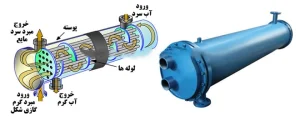 In this type, a series of small-diameter tubes (coils) are placed inside a larger-diameter shell. Typically, a low-temperature cooling fluid such as water flows through the small tubes, while a high-temperature gaseous fluid flows around the tubes inside the shell. Heat exchange occurs through the walls of the small tubes, where the cooling fluid absorbs heat from the hot gas, gradually converting it into a liquid. The liquid collects at the bottom of the shell and is discharged through a drain at the bottom of the condenser.