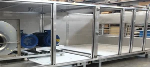 As mentioned, hygienic air handling units have a very similar structure to standard units but feature advanced filtration and sealing systems. The overall system often includes a chiller and a boiler: the chiller cools water and the boiler heats it. This warm and cold water flows through the copper coils of the air handling unit, adjusting the temperature of the air passing through the device. Various types of filters are used inside the unit based on the requirements.