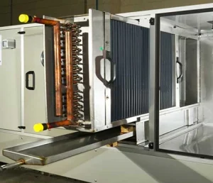 6. Coils are usually made of copper with aluminum fins. Beneath the coil, there is a tray made of aluminum or stainless steel with a gentle slope to collect and drain the water droplets that form on the coil, preventing the accumulation of contaminants. If corrosive chemicals are present in the ambient air, the fins should also be made of copper to enhance the coil’s resistance to corrosion. In any type of air handling unit (whether hygienic, like hospital air handlers, or non-hygienic), some of the moisture in the air condenses into water droplets upon contact with the cooling coils. These droplets must be collected and drained. One of the key features and standards for hygienic (clean) air handling units is that all parts should be designed with sliding mechanisms and rails for easy removal and internal cleaning.