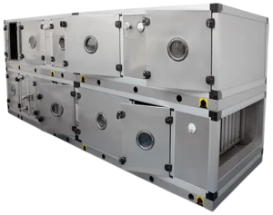 A hygienic or cleanroom air handling unit is structurally very similar to a standard air handling unit, with the primary difference being its construction for achieving 99.99% cleanliness of the incoming air through specialized filtration and advanced sealing. Hygienic air handling units are widely used in hospitals, laboratories, pharmaceutical companies, cleanrooms, food industries, data centers, electronics and semiconductor industries, aerospace industries, and some chemical (industrial) applications where contaminants such as suspended particles, allergens, pathogens, microorganisms, and more should not be transferred from one location to another through the air. Additionally, hygienic industrial air handling units and greenhouse air handling units are used in certain industrial and agricultural applications, respectively. The term “hygienic” reflects the device’s importance in critical HVAC systems for sensitive areas like hospitals and cleanrooms.