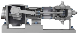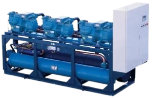 The most important component used in a chiller is its compressor. A chiller whose compressor is a reciprocating type (cylinder and piston) is called a reciprocating or impact compression chiller. A cutaway view of a reciprocating chiller is shown in the figure below. To understand its function, we will first describe the work cycle and its components, and then we will discuss its advantages and disadvantages, which will be our guide in choosing a suitable chiller.