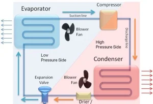 After the expansion valve, the liquid goes to the evaporator (the evaporator is also a winding coil) and this time by taking the heat of the environment around the coil, it turns into a gas and goes back to the compressor until this cycle is called the refrigeration cycle. to continue These are the most important components that make up an impact chiller (reciprocating), which in the following, while getting to know them in detail, we will also examine the disadvantages that these compressors create in the chiller.