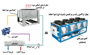 The main components of the reciprocating compression chiller and its performance. The main components in the reciprocating compression chiller are: 1 . The reciprocating compressor of the shock chiller is a positive displacement type compressor that keeps the volumetric flow relatively constant in a wide range of pressure ratios. Three types of compressors are usually used in reciprocating chillers: 1. Closed or hermetic compressor for chillers up to 25 tons of refrigeration 2. Semi-closed compressor for chillers up to 200 tons of refrigeration 3. Open compressor with direct connection to the drive for high capacity chillers in closed or hermetic type, the motor and compressor are directly coupled and placed inside a completely closed and sealed chamber with respect to the atmospheric air. In the open type, the motor and compressor are each placed in their own separate compartments. In general, the open type has a longer life, requires less maintenance and has a higher efficiency. Hermetic type is mostly used in low capacities. Of course, open compressors are usually more expensive than closed compressors. The components that make up these compressors are the same, and only the arrangement of the electric motor and the compressor are different. Compared to other compressors, these compressors cause disadvantages in reciprocating compression chillers, which we will mention at the end of this article. 2 . Reciprocating compression chiller condenser These condensers can be air-cooled or water-cooled. Water-cooled condensers may be chosen because they are cheaper than the two-tube or shell-and-coil type, or because they are denser and less bulky than the shell-and-tube type. Also, the use of air-cooled condensers (fan condensers) is as common as the shell and tube type. A chiller whose condenser is water-cooled or shell and tube is called a water-cooled (blue) chiller, and a chiller whose condenser is air-cooled or fan-cooled is called an air-cooled (air) chiller. The following figure shows the air-cooled type with its main components. 3 . Evaporators, which are also called evaporators, are usually of the shell and tube type, where the refrigerant evaporates when it passes through the tubes by absorbing the heat of the water around the tubes, and at the same time, the water that heats up It loses itself and becomes extremely cold, and this cooled water is sent with a pump for the required uses. 4 . The expansion valve of this valve adjusts the amount of refrigerant flow and pressure from the condenser to the evaporator in such a way that the refrigerant sucked by the compressor must be in a gaseous state and does not enter the compressor in liquid form. Excessive evaporation of the refrigerant should also be avoided because it will reduce the capacity of the device.