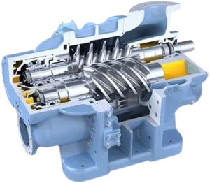 1. **Construction**: Screw compressors mainly consist of two rotating rotors (as shown in the image below). When one of these rotors is driven by an electric motor or other power source, the refrigerant is compressed between the two rotors.