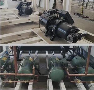 Bitzer, a German company, and Hanbell, a Taiwanese company, are among the leading designers and manufacturers of screw compressors globally. The image below shows examples of chillers being constructed at our factory, equipped with screw compressors from Bitzer and Hanbell.