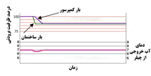 If capacity control is stepwise (non-continuous), the load of the compressors and chiller will not match the cooling load required by the building (or industrial equipment). As a result, the chiller will operate with either too much or too little load. For example, as shown in the diagram below, when the cooling load required by the building decreases from 100% to around 87% (green line), the load of the compressors and chiller fluctuates between 75% and 100% (blue line). This occurs because the chiller uses four fixed-speed compressors with no capacity adjustment. Each compressor operates in turn (25% to 25%) and when the cooling load reaches 87% of the chiller’s total capacity, all four compressors briefly activate, causing the chiller to operate at 100% capacity. When the temperature of the water exiting the chiller drops below 6°C, one of the compressors automatically shuts off, reducing the load of the compressors and chiller to 75% of the total capacity. As a result, the temperature of the water exiting the chiller increases to 8°C after a short period, causing the fourth compressor to turn back on, raising the chiller’s total capacity back to 100%, and the water temperature decreases back to 6°C.